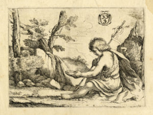Acquaforte. mm 221x301. Foglio: mm 280x364. Foglio al momento apparentemente non repertoriato. Il soggetto pare affine a invenzioni guercinesche, quali il San Giovannino seduto presso un albero (Bartsch,XVIII,2) databile attorno al 1650, o il San Giovannino che raccoglie acqua nella ciotola tradotto da Bartolozzi (DeVesme/Calabi, 2153). In alto sopra la figura stemma con tre pesci (delfini?). Bellissima impressione su carta vergellata con filigrana "lettere in cerchio singolo"(?). (1) Foglio integro con margini originari. Alone all'angolo superiore destro, lievissime pieghe di stampa.
