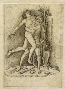 Bulino su pergamena. mm 245x180. Foglio: mm 265x198. Bartsch,XIII, 13. Hind, 3. Levenson/Oberhuber/Sheehan, 88. Lungo il lato destro la scritta «DIVO HERCULI INVICTO» con alcune lettere stampate orizzontalmente, e sulla tabella pendente dall'albero «IO AN BX». Incisione probabilmente derivata da un disegno del Mantegna e realizzata durante la permanenza dell'autore presso la bottega del maestro. Ottima e rara prova nell'unico stato censito. (1) Buoni margini di 7/12 mm, nastro di carta in alto al verso. Conservazione ottima.