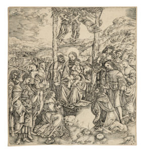 Bulino. mm 302x283. Hind, 10. TIB 25 (Commentary), 21.010. Bellini, 11. Levenson, Oberhüber, Sheehan, 118. Firmata "ROBETTA" in basso a destra. La composizione pare ispirarsi alla pala d'altare compiuta da Filippino Lippi nel 1496 e oggi agli Uffizi. Bellissima prova di grande freschezza e nitore, su carta vergellata sottile con parte di filigrana non identificabile. (1) Esemplare con sottili margini oltre la linea d'inquadramento ma con battuta del rame parzialmente visibile. Minimi residui di carta al verso in alto.