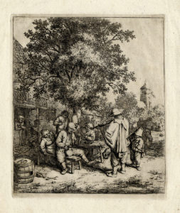 Acquaforte. mm 157x130. Foglio: mm 220x180. Godefroy, 45. Con il monogramma «AvO» a sinistra sul piano della botte. Ottima prova nel definitivo VI stato di 6 stampata con bel contrasto e tonalità su carta vergellata priva di filigrana. SI AGGIUNGE: Id., Busto di contadino con berretto a punta. 1650 ca. Acquaforte. mm 68x58. Godefroy, 3. Con il monogramma «AvO» ancora leggibile a sinistra al centro.Buona prova nel VII e definitivo stato su carta vergellata sottile. (2) OPERA 1: Foglio integro con ampi margini. Minimi residui di carta al verso. OPERA 2: Sottili margini oltre la linea d'inquadramento. Lieve piega di stampa trasversale al centro.