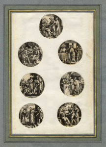 Bulino. Ø mm 55. Bartsch, 58-64. Hollstein, 71-77. Serie completa e omogenea in sette fogli. Ottime impressioni nell'unico stato su carta vergellata sottile. Al verso di tutti i fogli sigla a penna di William Baillie (Lugt, 2603). Le tavole sono applicate con linguetta in alto a montaggio di collezione decorato con al verso marchio Emile Lachenaud (Lugt, 3473). (7) Tutti gli esemplari sono rifilati alla linea d'inquadramento in tondo e controfondati con carta Giappone.