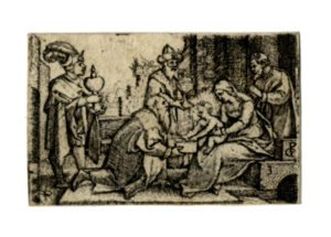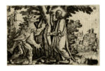 Bulino. mm 36/38x57/58. Bartsch, 32 e 39. Landau, 33 e 41. Hollstein, 43 e 51. Terza e undicesima tavola, con il monogramma e il numero progressivo, da La vita di Cristo, serie in ventisei fogli realizzata tra il 1534 e il 1535. Buone prove su carta vergellata. (2) Entrambi i fogli rifilati all'impronta, visibile a tratti. Applicati a pieno su carta più spessa.