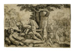 Bulino. mm 75x113. Bartsch, 68. Landau, 71. Hollstein, 36. Con il monogramma e la data "1543" all'angolo superiore destro entro tabella. Bella impressione nel II e definitivo stato, su carta vergellata sottile priva di filigrana. SI AGGIUNGE: Id., Tobia affida Tobiolo all'arcangelo Raffaele. Bulino. mm 70x89. Bartsch, 16. Landau, 15. Hollstein, 29. Quarta tavola da La storia di Tobia serie in sette fogli realizzata attorno al 1543. Buona prova su carta vergellata sottile. (2) OPERA 1: Foglio rifilato alla battuta del rame, parzialmente visibile. Piccola integrazione di carta all'angolo inferiore sinistro. Due macchioline puntiformi nell'inciso e lieve traccia d'uso. OPERA 2: Foglio rifilato mancante di 10 mm di inciso a destra.