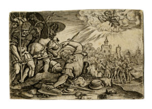 Bulino. mm 75x113. Bartsch, 69. Landau, 72. Hollstein, 67. Con il monogramma e la data entro tabella in basso verso destra. Buona impressione su carta vergellata sottile priva di filigrana. (1) Foglio rifilato all'impronta del rame, visibile per larghi tratti. Al verso assottigliamento della carta e residuo di nastro cartaceo in alto. Lieve traccia d'uso.