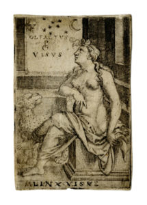 Bulino. mm 80x51. Bartsch, 106. Landau, 105. Hollstein, 104. Con il monogramma sulla lastra al centro tra il titolo latino e i residui della scritta cancellata "OLFACTUS". Al margine inferiore la lettera "LINX VISU" su traccia di abrasione di iscrizione precedente. Dalla serie I cinque sensi, incisa attorno al 1544. L'autore per la prima volta rappresenta la figura umana abbinata all'animale simbolo del senso raffigurato, in questo caso la lince. La lince appare correttamente come un gatto maculato e non come il verme bianco dei bestiari medievali. Bella prova su carta vergellata sottile. (1) Foglio con sottile margine oltre la battuta del rame. Minimi residui di vecchia colla in alto e in basso al verso. Lieve traccia d'uso.