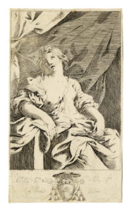 Acquaforte. mm 240x142. Bartsch, 1. Al margine inferiore si legge la dedica al cardinal Gabriele Paleotti con al centro lo stemma. Ottima impressione di questa acquaforte, rara nella esigua produzione del Sirani, stampata su carta vergellata sottile con filigrana "sole a sei raggi su lettere PM" (Bologna, fine XVII secolo). (1) Foglio con piccoli margini oltre la linea d'inquadramento. Breve strappo in basso al centro riparato al verso con tassello di carta, Lievi tracce d'uso.