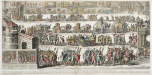 Acquaforte in coloritura. mm 384x760. Foglio: mm 390x810. Dai Trionfi di Onofrio Panvinio. (1) Buoni margini.Traccia di piega di legatura e di altre pieghe in verticale.