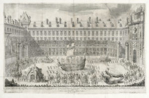 Bulino. mm 440x700. Foglio: mm 500x755. Hollstein, 31. Firmata sulla lastra in basso a destra. A sinistra la responsabilità di Nikolaus van Hoy (Anversa, 1631-Vienna, 1676) per l'invenzione. Grande ed elaborata tavola illustrativa della danza equestre rappresentata nel cortile dell'Hofburg a Vienna in occasione delle nozze di Leopoldo I e Margherita di Spagna. Il grande foglio faceva parte dell'apparato illustrativo del libretto La Contesa Dell'Aria, E Dell'Acqua: Festa À Cavallo Rappresentata Nell'Augustissime Nozze Delle Sacre, Cesaree, Reali M.M. ....Inventata e descritta da Francesco Sbarra con musiche di Antonio Bertali. Ottima prova stampata con bella tonalità su carta vergellata pesante con filigrana. (1) Foglio integro con margini originari. Pieghe da inserimento in volume, una aperta all'estremità sul lato sinistro