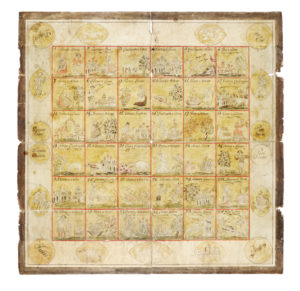 Penna e inchiostro bruno, acquerello a colori su carta vergellata pesante. mm 777x777. Rara tavola dipinta, con al verso appunti e schizzi di epoca posteriore, a penna e inchiostro bruno tra i quali si legge la data "1824". Intorno alla prima metà del secolo XVIII in Italia, probabilmente importato dalla Spagna si era diffuso un gioco d'azzardo, simile alla roulette, che tutti chiamavano Biribissi o Biribisso, dal termine spagnolo Biribiss. In origine questo gioco d'azzardo si svolgeva su una tavola composta di 36 figure, ognuna delle quali raffigurava animali, piante, fiori e contrassegnata da un numero. Agli angoli del tabellone entro ovali le scritte "Pari", "Dispari", "Dentro", "Fuori". Si gioca tra un banco e un numero illimitato di giocatori. Questi puntano una somma di danaro su una delle 36 caselle figurate e numerate dello scacchiere (in Francia 70); il banchiere estrae allora un numero da un sacchetto e i giocatori che hanno puntato sul numero estratto vincono trentadue volte (o 64 in Francia) la propria posta, mentre il banchiere incamera le altre puntate. Il giuoco era praticato da ricchi o da coloro che miseramente falliti nelle finanze, ostentavano false ricchezze, e perseguitati dai creditori si sedevano al tavolo nella speranza di azzeccare la figurina giusta. Il ruolo del banchiere in genere era svolto dal padrone di casa, dal ricco signore che ospitava, una sorta di moderno croupier, il quale spessissimo, investendo poco incassava parecchio. Il gioco è descritto nel Vocabolario degli accademici della Crusca, Volume 2, Parte 1, del 1866, dove si legge: "BIRIBISSO o BIRIBISSI, m. Giuoco di sorte, il quale si fa tra un banchiere e quanti giocatori si vogliono. A far questo giuoco si sogliono adoperar certe pallottoline forate per lo lungo, in ciascuna delle quali s'introduce un numero dall' uno in su progressivamente. Tali numeri sono più o meno, secondo le diverse usanze de' diversi paesi, e corrispondono ad altrettanti segnati sopra un tavoliere in separate caselle, dipinte a figure umane e animalesche. Vincitore è quegli che, avendo messo una moneta sopra un numero, ha la fortuna che il numero medesimo sia cavato dalla borsa o dall' urna, ove si pongono e si agitano le pallottoline suddette. La vincita è regolata in questa proporzione, che se, per esempio, i numeri sono 36, come si usa da noi, il banchiere paga al vincitore 32 delle monete da esso giocate. Una tal regola per altro non è costante, variandosi ancor essa a piacimento. Questa è la definizione che ne dà il Gherardini. Il Biribissi è antico fra noi, e si trova ricordato, per proibirlo, ne' Bandi antichi. Lo usarono poi il Neri nel Samminiato, e l' Autore della Celidora. Neri, Sammin. 3, 42 : « Consumano il tempo intorno al giuoco, Sempre avendo a rubare il pensier fisso. Con le carte d' alzata e il biribisso. »". (1) Presenza di varie pieghe spesso aperte, strappi e tracce d'uso dovute all'utilizzo del tabellone per la pratica del giuoco. Fragilità.
