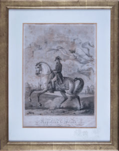 Bulino e pointillé. mm 420x295. In basso a sinistra "Composé et dessiné par Carle Vernet" e a destra "Gravé par Simon". Il margine inferiore interamente occupato dal titolo. Napoleone a cavallo con la vittoria alata che sorregge la corona d'alloro sulla sua testa e più in alto cartiglio a nastro con la scritta "campagne d'Italie". (1) In cornice dorata moderna, cm 59,5x47