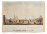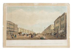 Litografia. mm 452x625. In basso sotto l'immagine a sinistra "J. e G. Fratelli De Andrea dis. dal vero 1852", al centro "Lit. G. Draghi in Venezia" e a destra "G.B.Cecchini dis. In pietra 1853". Al margine inferiore titolo in italiano e francese e dedica a Mohamed Seid Pascià. SI AGGIUNGE: Id., Grande Piazza in Alessandria di Egitto / Vue de la grande Place à Alexandrie d'Egypte. Litografia. mm 430x640. In basso sotto l'immagine a sinistra "J. e G. Fratelli De Andrea dis. dal vero", al centro "Lit. G. Draghi in Venezia" e a destra "G.B.Cecchini dis. In pietra". (2) OPERA 1: Strappo in alto a destra. Ingiallimento da esposizione lungo i quattro lati, alcuni brevi strappi. OPERA 2: Ingiallimento da esposizione lungo i quattro lati, alcuni brevi strappi.