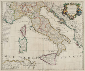 Incisione in rame con confini in coloritura. mm 472x560. Foglio: mm 488x585. Carta dell' Italia, le sue isole e la costa della Dalmazia. In alto a destra la carta è arricchita dal cartiglio con il titolo fiancheggiato dalle Virtù, su lato sinistro tredici scale. (1) Foglio integro con margini originari. Piega verticale al centro con residui di brachetta di legatura al verso. Lieve diffuso ingiallimento.