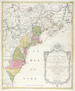 Incisione in rame in coloritura. mm 605x495. Foglio: mm 680x540. Mappa delle tredici colonie inglesi, ciascuna identificata per nome sia sulla mappa, sia nel titolo posto entro cartiglio decorativo sormontato dallo stemma reale britannico. Il titolo e la nomenclatura in francese come il nome dell'autore, fanno supporre che la carta fosse destinata al mercato francese. Le tredici "Province unies" sono rappresentate abbastanza correttamente sebbene il Maryland e la Georgia abbiano una forma strana, sono riportati molti toponimi e alcuni dettagli interessanti da segnalare nella regione dei Grandi Laghi. (1) Foglio integro con margini originari. Alcuni forellini alle estremità. Mancanza di carta all'angolo in alto a sinistra.