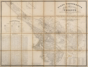 Incisione in rame. Formato aperto: mm 895x1125. Formato chiuso: mm 225x140. In basso al centro"Inciso da Giuseppe Müller".Grande carta topografica del territorio triestino "indicante distintamente le differenti specie di coltura dè terreni, le precise posizioni degli edifizi sì urbani che campestri, come pure le acque i ponti e le strade,...". Sulla sinistra due estese legende una con "SPIEGAZIONE dei segni" e l'altra sottostante con "ELENCO dei proprietari delle case di campagna...", in basso a destra "INDICAZIONE degli oggetti più rimarchevoli,...". (1) Mappa in 32 tavole a stacco riportate su tela.