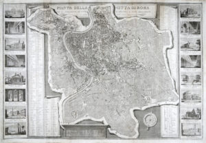 Incisione in rame. mm 770x1115. Foglio: mm 795x1145. Firmata sulla lastra in basso a sinistra sotto la legenda. Mappa della città all'interno della cinta muraria raffigurata come lastra lapidea affissa almuro con grappe metalliche. Su ciascun lato sono collocate otto piccole vedute dei monumenti più insigni, al sinistro è presente una ricca legenda delle località e dei principali monumenti. (1) Foglio integro con margini originari. Lieve traccia di pieghe, minime fioriture e piccoli difetti localizzati alle estremità.