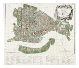 Incisione in rame in coloritura. mm 478x555. Carta basata sulla mappa di Lodovico Ughi pubblicata nel 1729. Cartiglio in alto a destra con titolo, spiegazione dei segni, responsabilità editoriale. Al margine inferiore estesa legenda dei luoghi e dei monumenti. Esemplare in III stato di questa popolare mappa edita per la prima volta nel 1792, che conobbe ben quindici versioni prima del 1847, per lo più con solo la data cambiata. (1) Rifilata all'impronta. Traccia di pieghe.