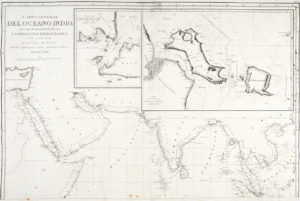 Incisione in acciaio. mm 585x875. Mappa del sud-est asiatico e dell'Oceano Indiano. In alto due grandi riquadri mostrano lo Stretto della Sonda e lo Stretto di Banca, Gaspar e Billiton. Sono rappresentate anche l'Arabia e l'Africa orientale. Questa carta nautica faceva parte del progetto dell'ufficio idrografico spagnolo di mappare i domini della corona e le rotte spagnole.