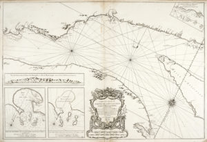 Incisione in rame. mm 598x885. Secondo stato dopo l'inserimento di tre riquadri a sinistra: 1) Vue des terres entre la Pointe des Montspelés et celle de Manicouagan étant au Point du Relevement marqué A.2) Baye des Sept Isles, copiée sulla Carte du Fleuve S. Laurent que les Anglois, pubblicata nel 1760; 3) Les Sept Isles, telles qu'elles ont eté Leveés par Mr. Deshayes en 1686; e un riquadro in alto a destra: Rade et Isles du Mingan, suivant la carte Angloise de 1760, sur la même echelle que la Carte Francoise du 1761. (1) Foglio integrocon margini originari. Traccia di piega verticale al centro.