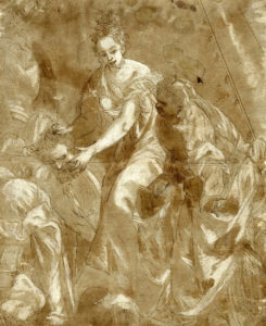 Penna e inchiostro bruno, pennello e acquerello seppia, rialzi in bianco su carta preparata color tortora. Foglio applicato a pieno su carta vergellata pesante. mm 325x268. (1) Applicato per due punti in alto a montaggio decorato. Con il montaggio, mm 445x390.
