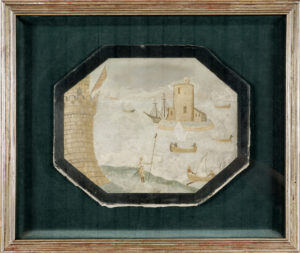 Anonimo della fine del XVII e inizi del XVIII secolo, Due marine con torre di avvistamento e ricovero per barche.