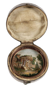 Micromosaico su base rotonda in rame. Ø cm 6,8. In astuccio rotondo in cuoio con chiusura a gancio, sul coperchio impresso decoro a stelle. All'interno ghiera in rame e sottile base in porfido rosa (con fratture), coperchio foderato in seta ecrù. (1)