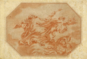 Matita rossa su carta vergellata color crema con filigrana "abete su cartiglio con fiori" (Germania ca. 1787). mm 210x303. Da uno dei pannelli per la chiesa dei Gesuiti di Anversa eseguiti da Rubens tra il 1620 e il 1621. Jacob De Wit ne trasse dei disegni da consegnare a Jan Punt (Amsterdam, 1711-1779) per la tiratura delle relative incisioni. Il disegno si configura piuttosto come esercitazione probabile dall'incisione di Jan Punt come pare confermare la carta che presenta una filigrana tedesca di fine XVIII secolo. (1)