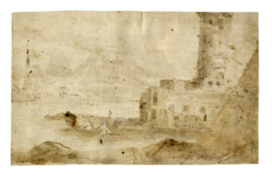 Penna e inchiostro bruno, pennello e acquerello grigio su carta bianca. Al centro del torrione la scritta a penna e inchiostro bruno «Thomas Wijck in Napoli agosto 1659». mm 235x285. Applicato a pieno su vecchio cartoncino, al verso marchio di collezione non identificato ovvero Maria Paternò Castello Ricci (1847 ? - 1915 ?), Lugt 5081. (1)