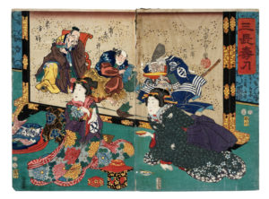 Nishike-e, xilografia a colori. Formato: ôban verticale, dittico (parte di trittico) mm 368x500. (1) Colori freschi. Due fori di tarlo, piega centrale aperta in alto e in basso, lacerazione al centro in prossimità della giunzione dei fogli.