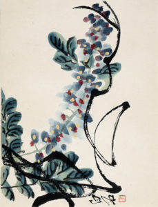 Xilografia a colori su fondo a stampa. mm 234x307. Foglio: mm 300x430. Firmata in basso a destra: Báishí. Illustrazione di fiori rosso intenso su un ramo che sporge dal bordo destro dell'immagine. Al lato destro si legge l'iscrizione "Durante la stagione fredda, questo fiore è anche amico del fiore di prugna" con in basso sigillo della firma impresso in rosso. La tavola è stata utilizzata per la copertina del libro di Werner Klemke, Blumen und Vögel. Farbholzschnitte aus China, pubblicato dalla Buchheim-Verlag nel 1956. SI AGGIUNGE: Id.,Wisteria (glicine). mm 233x305. Con sigillo rosso in basso a sinistra. (2) Buona conservazione.