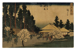 Xilografia a colori (nishiki-e). Formato: ôban orizzontale mm 218x342. Firma: Hiroshige ga. Editore: Fujiokaya Keijirô (Shôrindô). Data: 1839-42 (Tenpô 10-13). Censura: nessun sigillo di censura. Dalla serie Edo meisho (Luoghi famosi a Edo). (1) Colori ben conservati, foglio lievemente brunito rifilato al soggetto.