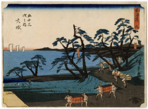 Xilografia a colori (nishiki-e). Formato: chûban orizzontale mm 168x230. Foglio: mm 174x236. Firma: Hiroshige ga. Editore: Tsutaya Kichizô (Kôeidô) . Data: ca. 1850-51 (Kaei 3-4) . Censore: Hama Hahei, Kinugasa Fusajiro. Nona tavola dalla serie Tôkaidô gojûsan tsugi no uchi (Le cinquantatre stazioni della Tokaido). (1) Colori molto freschi. Piccolo margine. Conservazione ottima.