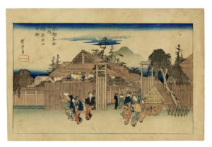 Xilografia a colori (nishiki-e). Formato ôban orizzontale mm 215x345. Foglio: mm 258x384. Tavola dalla serie Luoghi famosi di Kyoto pubblicata per la prima volta nel 1834 dall'editore Eisendo, qui in tiratura moderna a cura dell'editore Yuyudo. (1) Foglio integro con colori ben conservati. Tracce d'uso.