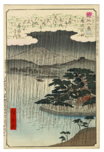 Xilografia a colori (nishiki-e). Formato ôban verticale mm 338x223 Foglio: mm 355x240. Firma: Hiroshige ga. Editore: Tavola dalla serie Ômi hakkei no uchi (Otto vedute di Omi), reintagliata per edizione moderna. In alto iscrizioni da testo poetico "Yo no ame ni/ oto o yuzurite/ yûkaze o/ yoso ni na tatsuru/ Karasaki no matsu". (1) Colori freschi. Esemplare applicato ai lati su supporto di carta leggera.