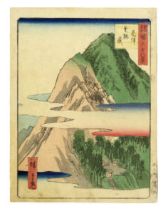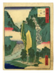Xilografia a colori (nishiki-e). Formato: chūban verticale mm 225x167. Foglio: mm 245x184. Firma: Hiroshige ga. Censore: Aratame. Dalla serie Shokoku rokujū-hakkei (Sessantotto vedute di varie province). Il santuario nell'immagine è probabilmente il santuario Tōshō-gū sulla montagna, Kunozan Tōshō-gū, sebbene non vi sia un'indicazione diretta. SI AGGIUNGE: Id., Hida Norikura-dake (Picco Norikura, provincia di Hida). Formato: chūban verticale mm 227x167. Foglio: mm 245x184. Firma: Hiroshige ga. Editore: Tsutaya Kichizō (Kōeidō). Censore: Aratame. (2) Colori freschi. Ottima conservazione.