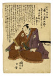 Xilografia a colori (nishiki-e). Formato: ôban verticale mm 374x258 (dittico in tavole separate). Firma: Gototei Kunisada ga. Editore: Enomotoya Kichibei. Censura: kiwame. Doppio ritratto di famosi attori nell'Atto VII, scena della casa del te Gion Ichiriki, dal dramma Kanadehon Chūshingura di Takeda Izumo II, Miyoshi Shoraku e Namiki Senryu; rappresentato a Nakamura nel settimo mese del 1825 (Bunsei 8). La parte alta dei due fogli è occupata da lunghe iscrizioni, un dialogo che avviene in prossimità dell'inizio dell'Atto VII. Il capo dei servitori Oboshi Yuranosuke finge di essere ubriaco mentre ridicolizza l'umile lacchè Teraoka Heiemon. Avendo sentito che c'è un piano per vendicare la morte del loro signore, Heiemon sta supplicando di potersi unire al gruppo dei servi più fedeli ma, diffidente nei confronti del nemico, Yuranosuke nega che un tale piano esista. (2) Colori ben conservati. Piccole tracce di tarlo, forellini di legatura. Segni d'uso.