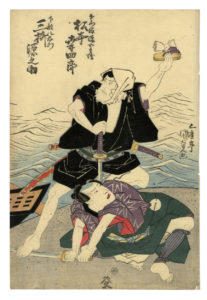 Utagawa Kunisada I (Toyokuni III), Gli attori Bandō Shinsaku nel ruolo di Kikukawa Tomoroku e Bandō Mitsugorō III nel ruolo di Nippon Daemon. 1827.
