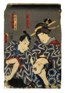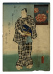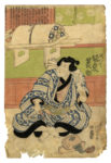 Xilografia a colori (nishiki-e). Formato: ôban verticale mm 360x250. Firma: Toyokuni ga in toshidama. Editore: Ōtaya Takichi. Censura: aratame. SI AGGIUNGE: Id., Tre attori. Xilografia a colori (nishiki-e). Formato: ôban verticale mm 383x260. Firma: Toyokuni ga in toshidama. Editore: Ebisuya Shōshichi. Censore: Magomi Kangeyu. SI AGGIUNGE: Id.,Personaggio seduto. Xilografia a colori (nishiki-e). Formato: ôban verticale mm 380x260. Firma: Kunisada ga (?). Censura: kiwame. (3) OPERA 1: Colori ben conservati. Foglio applicato su carta Giappone. Mancanza di carta in basso, lievi difetti e traccia d'uso. OPERA 2: Colori freschi. Alcune mancanze nella parte alta, forellini al lato destro, lacerazione in basso al verso. OPERA 3: colori affievoliti. Difetti di conservazione.