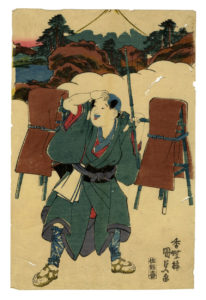 Xilografia a colori (nishiki-e). Formato: ôban verticale mm 375x255. Firma: Kōchō Kunisada ga. Editore: Sanoya Kihei. SI AGGIUNGE: Id.,Ragazzo che trasporta due cavalletti sullo sfondo del monte Fuji. Xilografia a colori (nishiki-e). Formato: ôban verticale mm 344x227. Firma: Kōchō Kunisada ga. Editore: Sanoya Kihei. (2) OPERA 1: Colori freschi. Tracce di talo. OPERA 2: Colori freschi. Tracce di tarlo.