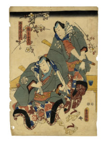 Xilografia a colori (nishiki-e). Formato: ôban verticale mm 370x260. Tavola di sinistra di trittico.Firmato: Toyokuni ga in toshidama. Censore: Mera, Watanabe. Editore: Fujioka-ya Keijirō. Dramma rappresentato a Edo (Kaei 05, 1852) e dedicato ai famosi cinque uomini cavallereschi o cavalieri erranti (gonin otoko), con l'attore Arashi San'emon IX nel ruolo dell'otokodate Gokuin Sen'emon, e Ichikawa Danjūrō nel ruolo di Nunobukuro Ichizaemon. (1)