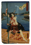 Xilografia a colori (nishiki-e). Formato: ôban verticale mm 367x260. Firmato: Toyokuni ga, in toshidama. Censore: aratame, Dragone 6. Editore: Ebisuya Shôshichi (Kinshôdô). Parte destra di dittico raffigurante episodio del dramma Onatsurae Satsuma no shingata rappresentato nel teatro di Nakamura nel giugno 1856. SI AGGIUNGE: Id., L'attore Ichikawa Kodanji IV nel ruolo di Kyushichi nyōbō Otaki. 1857. Xilografia a colori (nishiki-e). Formato: ôban verticale mm 360x240. Firmato: Toyokuni ga, in toshidama. Censura: aratame, Migo. Data: 1857 (Ansei 4). Editore: Ebisuya Shôshichi (Kinshôdô). Parte sinistra di dittico raffigurante episodio del dramma Katakiuchi uwasa no Furuichi rappresentato a Ichimura nell'aprile 1857. SI AGGIUNGE: Id., Il suicidio del samurai Shirai Gonpachi. Xilografia a colori (nishiki-e). Formato: ôban verticale mm 358x245. Firmato: ni konomi Toyokuni ga, in toshidama. Censura: aratame. Editore: Ebisuya Shôshichi (Kinshôdô). (2) OPERA 1: Colori freschi, alcune tracce di tarlo al lato sinistro. Altrimenti conservazione ottima. OPERA 2: Colori freschi. Tracce di tarlo in alto e al lato sinistro. OPERA 3: Colori freschi. Larga spellatura con inizio di lacerazione nella parte centrale al verso. Foglio fragile.