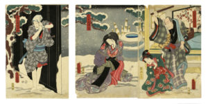 Nishike-e, xilografia a colori. Formato: ôban verticale, trittico mm 365x740. Firmato: Kochoro Toyokuni ga. Data: Aratame serpente 5, 1857, due sigilli separati. Il trittico raffigura una scena kabuki del joruri Akegarasu Yuki no Urazato rappresentato per la prima volta a Nakamura nel maggio 1857. I joruri erano drammi in forma di ballata con la narrazione cantata e accompagnata da musica. Qui, il samurai Tokijro è venuto a salvare la sua dolce metà, la cortigiana Urazato, che era stata picchiata dal suo datore di lavoro e legata nel cortile innevato per aver incontrato il suo amante. Nel pannello di destra Midori, figlia della coppia, e Yamanaya Shirobei proprietario della casa dove Urazato era costretta a lavorare per recuperare una pergamena in possesso del suo aguzzino. A sinistra l'attore Nakamura Fukusuke I nel ruolo di Kasugaya Tokijiro, al centro Iwai Kumesaburo III nel ruolo di Yamanaia Urazato, a destra Bando Mitsugoro VI nel ruolo di Midori e Seki Sanjuro III nel ruolo di Yamanaya Shirobei. (2)