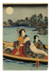 Xilografia a colori (nishiki-e). Formato: ôban verticale mm 365x250. Firma: nanajūhachi-sai Toyokuni hitsu (di 78 anni). Editore: Ebisuya Shōshichi. Censore: Kai 9. Intagliatore: Chōkō ryūzō. SI AGGIUNGE: Id., Minazuki (Il sesto mese), dalla serie Wakamurasaki nenjû gyôji no uchi (Eventi annuali per i giovani a Murasaki). Xilografia a colori (nishiki-e). Formato: ôban verticale mm 375x258. Data: 1847-52 (Kôka 4-Kaei 5). Firma: Toyokuni ga, in toshidama. Editore: Ebisuya Shôshichi (Kinshôdô). Censore: Kinugasa, Watanabe. Tavola centrale di trittico. (2) OPERA 1: Colori freschi. Esemplare controfondato con carta Giappone. Forellini e traccia di tarlo principalmente al lato sinistro. OPERA 2: Colori freschi. Lieve traccia d'uso.