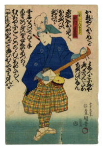 Xilografia a colori (nishiki-e). Formato: ôban verticale mm 352x237. Firmato: Nanajûkyûsai Toyokuni hitsu. Intagliatore: Katada Chôjirô (Hori Chô). Marchio intagliatore: Katada Hori Chô. Censore: Ratto 7 aratame. Editore: Daikokuya Kinzaburō (Shōjudō) Yamamura Kinzaburō. Il personaggio interpretato fu un famosissimo artista di strada degli anni Cinquanta e Sessanta, il terribile Benikan (Beni-ya-Kanbee) più volte accusato per i suoi gravi difetti morali quanto ammirato per la sua fama stellare. (1) Colori ben conservati, foglio in ottimo stato di conservazione.