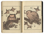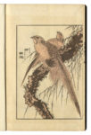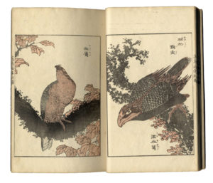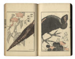 Formato: mm 240x160. Firma: Katsushika Taito ga. Editori: Suzan-bo, Edo. Gungyokudo, Naniwa. Raccolta di xilografie di fiori e uccelli impresse in rosa e grigio in 2 volumi completi, copertina in cartoncino nero marezzato con tassello del titolo impresso in rosso su fondo bianco. (2) Lievissime tracce di usura alle legature. Ottima conservazione.