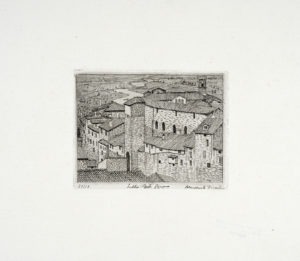 1) Campanile di S. Francesco a Gubbio. Acquaforte e bulino. Inciso: mm 345x187. Lastra: mm 359x201. Foglio: mm 485x335. bellini-alberti, 9. Firmata a penna a sfera in basso a destra e iscritto: "Gubbio. S. Francesco" in basso al centro. Esemplare nel I stato di 2. Operando una personale sintesi spaziale, Disertori ha reso possibile allo spettatore cogliere con un solo sguardo i principali simboli del potere della città. 2) Veduta di Gubbio. Acquaforte su carta con filigrana a stella. Inciso: mm 120x167. Lastra: mm 132x176. Foglio: mm 345x450. bellini-alberti, 8. Firmata a penna e inchiostro di china in basso a destra, al centro iscritto: "Gubbio. Porta Romana" e numerrata in basso a sinistra. Es. 18/25. Al verso titolata nuovamente e timbro de "Prof. Benvenuto Disertori". Provenienza: Eredi Disertori.