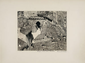 1) Borgo S. Antonio a Perugia. 1912-17. Acquaforte e bulino. Inciso: mm265x235. Lastra: mm 299x246. Foglio: mm 620x430. bellini-alberti, 16. Firmata a penna a sfera in basso a destra e iscritto al centro: "Perugia. Borgo Sant' Antonio". Al verso timbro de "Prof. Benvenuto Disertori". 2) Perugia. La porta dell'arco della Mandola (Mandorla). 1912-13. Acquaforte e bulino. Inciso: mm 261x314. Lastra: mm 276x343. Foglio: mm 435x620. bellini-alberti, 5. Firmata a penna a sfera in basso a destra e iscritto al centro: "Perugia. L'Arco della Mandola". Controfirmata in lastra in basso a destra e sinistra. Esemplare nel I stato di 2. Provenienza: Eredi Disertori. (2)