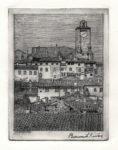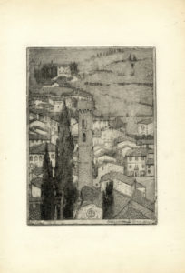 1) Arezzo. La torre civica. 1915-18. Acquaforte. Inciso: mm 177x132. Lastra: mm 198x148. Foglio: mm 525x385. bellini-alberti, 18. Firmata a penna e inchiostro di china in basso a destra e controfirmata in lastra in basso a sinistra. Questa veduta di Arezzo, raffigurante la Torre del Palazzo Comunale, costituisce un'importante documento di quello che doveva essere l'aspetto della città toscana all'inizio del secolo. 2) Panorama di Fiesole. 1913-14. Acquaforte.Inciso: mm 228x171. Lastra: mm 237x176. Foglio: mm 386x264. bellini-alberti,10. Firmata a matita in basso a destra. Provenienza: Eredi Disertori.