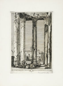 1) Il piede della dea Giunone. Acquaforte e bulino. mm 270x219. Foglio: mm 500x350. bellini-alberti, 37. Firmata a penna e inchiostro di china in basso a destra. 2) Il pronao del Tempio di Antonino e Faustina. Acquaforte e bulino. mm 350x240. Foglio: mm 535x400. bellini-alberti, 38. Firmata a penna a sfera in basso a destra e controfirmato in lastra in basso a sinistra. Provenienza: Eredi Disertori.