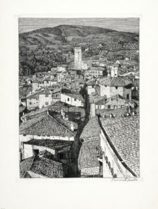 1) Perugia. Il campanile di S. Maria Nuova. 1919-20. Acquaforte e bulino. Inciso: mm 373x254. Lastra: mm 389x275. Foglio: mm 500x350. bellini-alberti, 39. Firmata a penna e inchiostro di china in basso a destra e controfirmata sopra, in lastra. 2) Perugia. Via dei Priori. 1920. Acquaforte e bulino. Inciso: mm 357x267. Lastra: mm 372x282. Foglio: 500x375. bellini-alberti, 40. Firmata a penna e inchiostro di china in basso a destra e controfirmata in lastra in basso a sinistra. Provenienza: Eredi Disertori.