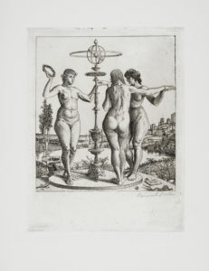 Acquaforte e bulino. Inciso: mm 234x209. Lastra: mm 306x236. Foglio: mm 510x350. bellini-alberti, 48. Firmata a penna a sfera in basso a destra e siglata in lastra in basso a destra. Il vaso visibile in basso a sinistra è un elemento che compare accanto alle Tre Grazie anche in alcune tra le più antiche rappresentazioni, ma risulta arricchito di una nuova valenza: se si osserva si scopre che esso è rotto e attraverso la fenditura fuoriesce un trapano, evidente riferimento di natura sessuale. Provenienza: Eredi Disertori.